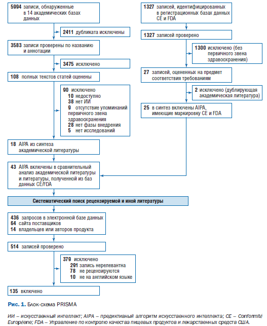 В данном обзоре рассматривались следующие методы МО: (глубокие) нейронные сети; метод опорных векторов и случайного леса, – разработанные для задач компьютерного зрения и обработки естественного языка, направленные на прогнозирование состояния здоровья отдельных пациентов. Мы классифицировали исследование как применяющее МО, если в нем использовался нерегрессионный статистический метод для разработки или проверки модели прогнозирования, аналогичный методу C.L. Andaur Navarro и соавт. [9], за исключением традиционных статистических подходов, таких как экспертные системы и деревья решений, основанных на экспертных знаниях. Исследования, посвященные разработке предиктивных алгоритмов МО или внешней валидации без внедрения в первичное звено здравоохранения, были исключены. Учитывая, что более 60% инструментов ИИ с маркировкой CE не встречаются в электронных исследовательских базах данных [12], в этот обзор были включены предиктивные алгоритмы МО с маркировкой CE или одобренные FDA, опубликованные в базах данных регистрации FDA и CE [18–20].