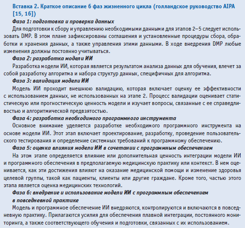 Министерство здравоохранения, благосостояния и спорта Нидерландов заказало разработку и валидацию голландского руководства по высококачественному диагностическому и прогностическому применению ИИ в здравоохранении. Опубликованное в 2022 г. голландское руководство по предиктивному алгоритму искусственного интеллекта (AIPA) применимо к предиктивным алгоритмам МО [15, 16]. Руководство поощряет сбор данных и доказательств в соответствии с 6 фазами и критериями, изложенными в жизненном цикле ИИ (требования), предоставляя всесторонний обзор существующих аспектов руководства по исследованиям на протяжении всего жизненного цикла ИИ.