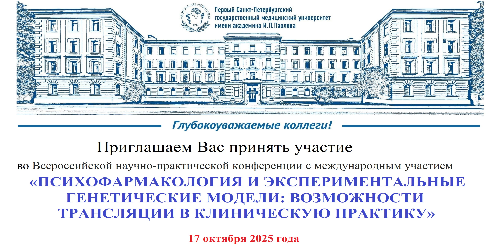 17 октября 2025 года в Санкт-Петербурге состоится Всероссийская научно-практическая конференция с международным участием «Психофармакология и экспериментальные генетические модели: возможности трансляции в клиническую практику».