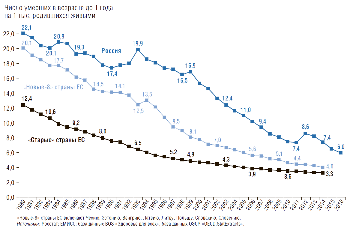Необходимо отметить, что младенческая смертность составляет 0,6% в общей смертности населения РФ (11,4 тыс. из 1,9 млн умерших в 2016 г.). Когда Минздрав России сообщает, что младенческая смертность в РФ ниже, чем в Европе, имеется в виду Европейский регион ВОЗ. В него наряду со странами ЕС входят также страны, в которых сохраняются очень высокие показатели младенческой смертности: Азербайджан (9,8 случая на 1 тыс. родившихся живыми), Армения (8,7), Грузия (9,5), Казахстан (9,8), Кыргызстан (19,9), Республика Молдова (9,6), Россия (7,4), Румыния (8,4), Таджикистан (11,8), Туркменистан (18,3), Узбекистан (10,7), Украина (7,9). Это и дает более высокое значение показателя младенческой смертности по Европейскому региону – 6,6 случая на 1 тыс. родившихся живыми.