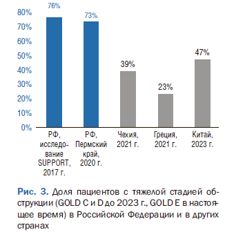 Для РФ расширение применения тройной терапии особенно актуально, так как по сравнению с развитыми странами в нашей стране значительно ниже доля зарегистрированных пациентов с ХОБЛ и выше их смертность, что свидетельствует о худшей диагностике и менее эффективном лечении. Недостаточная диагностика и проблемы в медицинской помощи пациентам с ХОБЛ отмечены, в частности, в работе С.Н. Авдеева и соавт., опубликованной в 2024 г. [34].