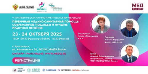 23–24 октября 2025 года в г. Красноярске состоится V Терапевтическая научно-практическая конференция «Первичная медико-санитарная помощь: современные подходы и лучшие практики лечения», проводимая в рамках плана научных мероприятий ФМБА России.