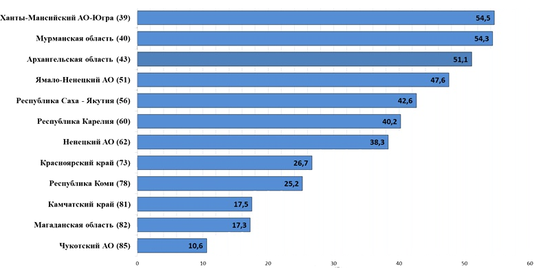 Ханты-Мансийское здравоохранение оказалось на первом месте несмотря на то, что госрасходы на здравоохранение у них на 48% больше, чем в среднем по стране. Это место им обеспечило высокое ОПЖ - на 1,6 года выше, чем в среднем по РФ и самое высокое в Арктической зоне. Самое низкое значение ОПЖ (64,4 года) - в Чукотском АО и Магаданской области, хотя в этих регионах на здравоохранение тратится на 50% больше, чем в среднем по РФ.