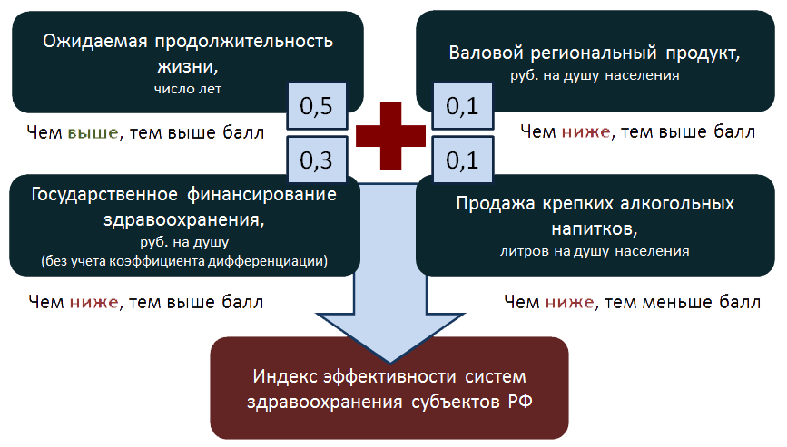 Эффективность означает возможность добиться того же результата за меньшие деньги или лучших результатов за те же деньги. Рейтинг основан на международной практике проведения подобных расчетов и рассчитывается на основании 4-х показателей, каждый из которых имеет свой удельный вес при подсчете баллов: