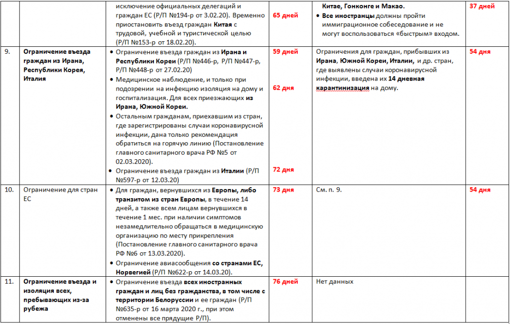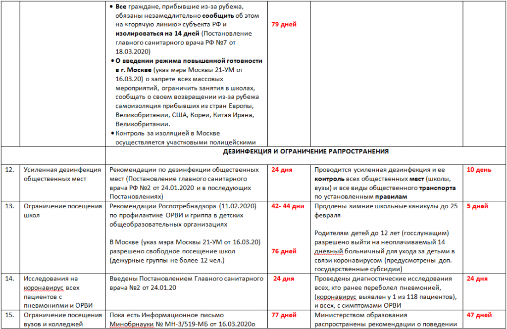 В России меры по ограничению распространения нового коронавируса, соответствуют рекомендациям ВОЗ и мерам, которые принимаются другими Европейскими странами. Однако в ряде случаев отстают по срокам и масштабам реализации по сравнению с Тайванем, подробно - см. табл. 1.